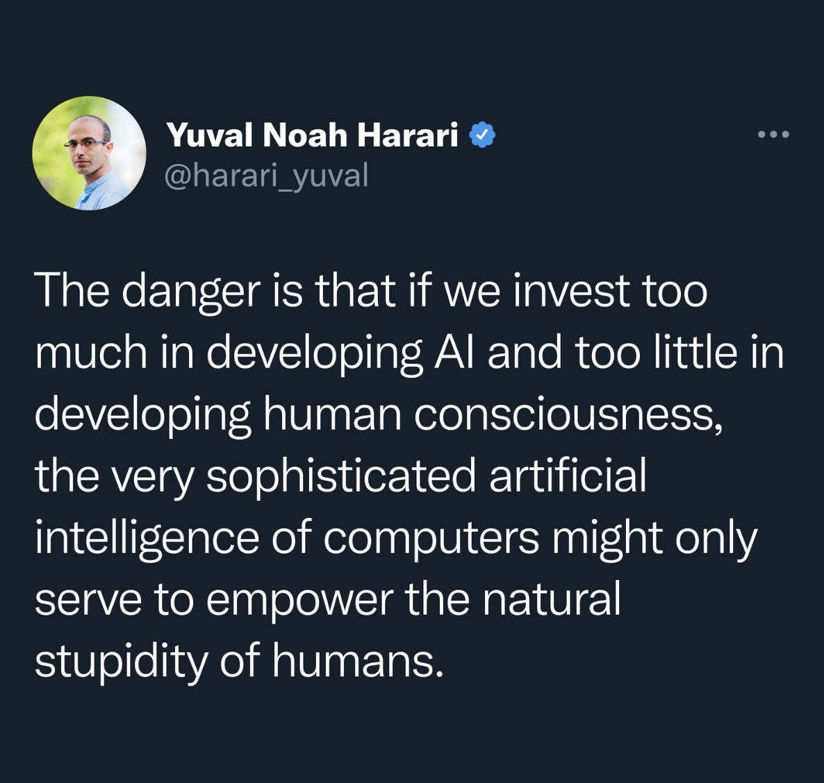 La inteligencia artificial es una nueva herramienta tecnológica extremadamente potente. Como decía incluso ChatGPT en su definición, permite potenciar las capacidades humanas. Quizá la pregunta fundamental sea cuáles son estas capacidades, y si van a ser potenciadas para construir un mundo mejor o si van a exacerbar las características negativas de nuestra especie. Yuval Harari lo resume de una manera bastante cruda: