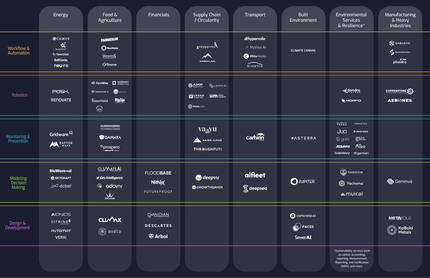 Otro gran grupo de proyectos son los orientados al procesamiento de imágenes satelitales para la planificación de operaciones de industrias (Descartes Labs, Terramonitor o Flutura), para conservación (como EarthRanger, que ayuda a administradores de áreas protegidas, ecologistas y biólogos a tomar decisiones operativas para la conservación de especies en peligro de extinción) y para prevención de desastres climáticos (Tomorrow.io y One Concern, por ejemplo).